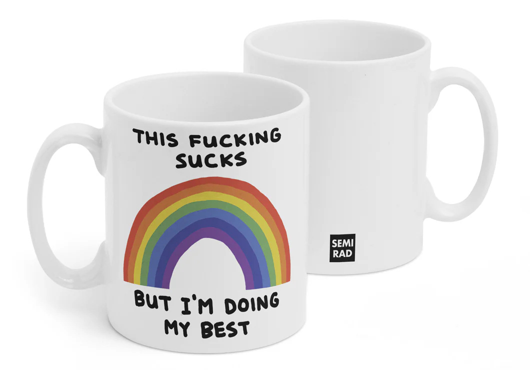 I mentioned this new shirt design a few weeks ago, and the [bestselling] coffee mug design below it as well, and I was thinking they’re both quite simply worded, but kind of have a similar ethos: We’re doing OK.